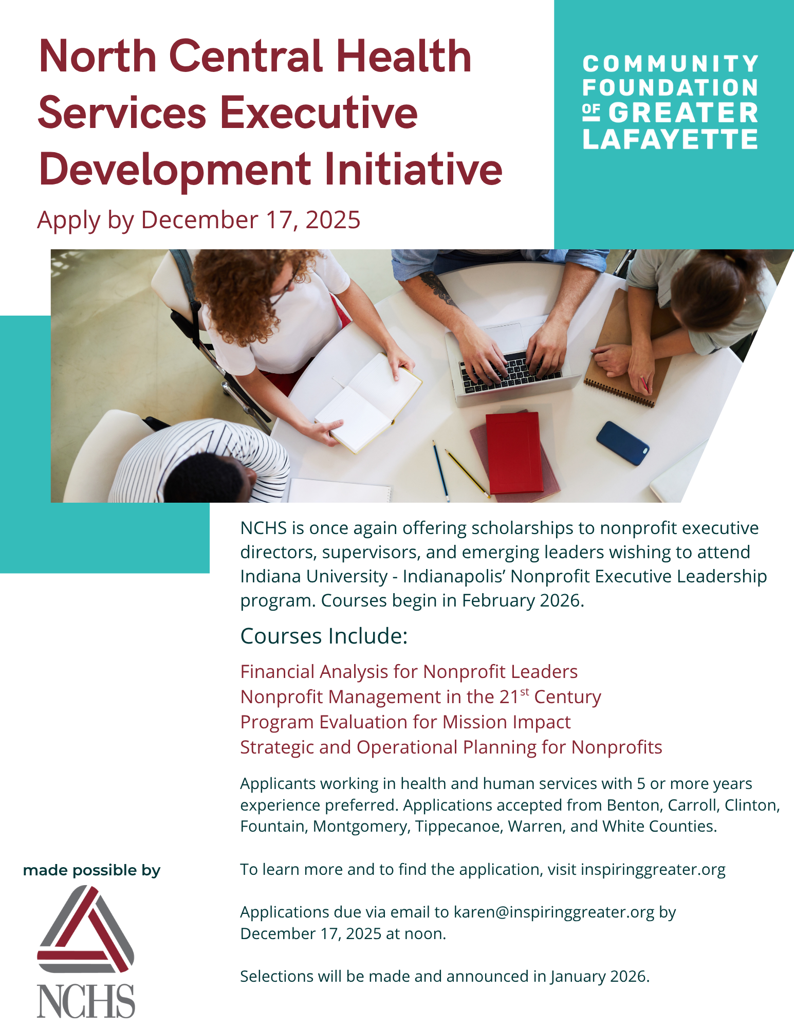 North Central Health Services is offering scholarships to area nonprofit executive directors, supervisors and emerging leaders interested in receiving their certification in Nonprofit Executive Leadership. The Indiana University – Indianapolis’ Nonprofit Executive Leadership program is an executive education certificate program utilizing an accelerated curriculum to fit executives’ busy schedules. Four two-day seminars are held over the course of eight months beginning in February 2026 (click here for course descriptions and program information):